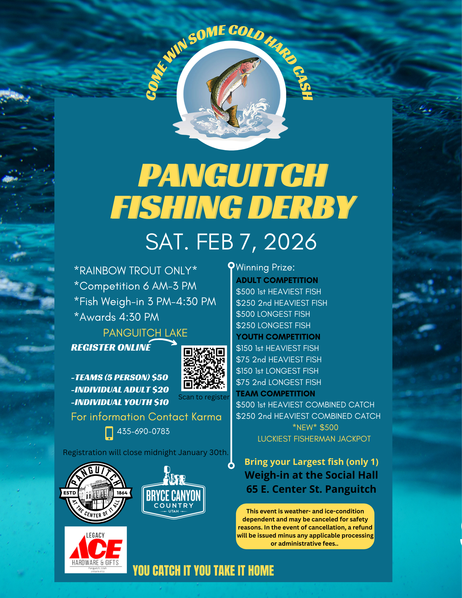 Enjoy a days of ice fishing fun at Panguitch Lake! Fishing starts at 6 am Saturday February 7, 2026, and goes to 3:00 PM. Then you bring your biggest fish (only one) to the Social Hall 65 E. Center St. in Panguitch from 3:00 PM- 4:30 PM for weight-ins. Only rainbow trout will be allowed!! Registration ends at midnight January 30, 2026.